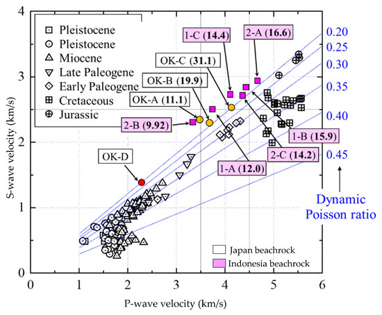 Beachrock is a carbonate sedimentary product, and its sedimentary characteristics were examined in this study. It has an anchoring effect in dynamic islands and provides protection from erosion. A lot of information regarding its origin and properties remains either unknown or the subject of continued debate. Outcrops of beachrock sediment are valuable records of the past climate of low-lying reef islands, which are generally found in the tropics and subtropics area and mostly in warm seawater [10,11,12,13]. In Indonesia, the beachrock plays the role of protecting the coastline from storms, and there are also examples in eastern Kume Island and the Great Barrier Reef in Australia [14,15]. Table 1 summarizes the results of physical and mechanical tests conducted on the beachrock whose geological formation was similar to that in Japan [16,17]. According to previous research, the beachrock was formed only a few thousand years ago, and as its ages, the VP, VS, and mechanical strength increase. Suzuki et al. [18] explained the relationship between the age of beachrock formation and the strength based on Okinawa beachrock properties. In particular, the mechanical compressive strength is 3.7 to 17 MPa, which is similar to the strength of sedimentary rocks from the late Miocene to Pliocene.