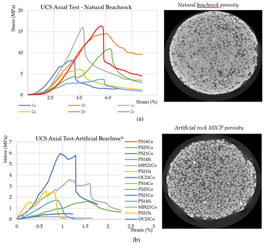 Comparison of the unconfined compressive strength (UCS) axial load between (a) natural beachrocks and (b) artificial rock based on the microbially induced carbonate precipitation (MICP) method with x-ray computed tomography (X-ray CT) scan images of porosity.