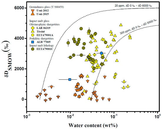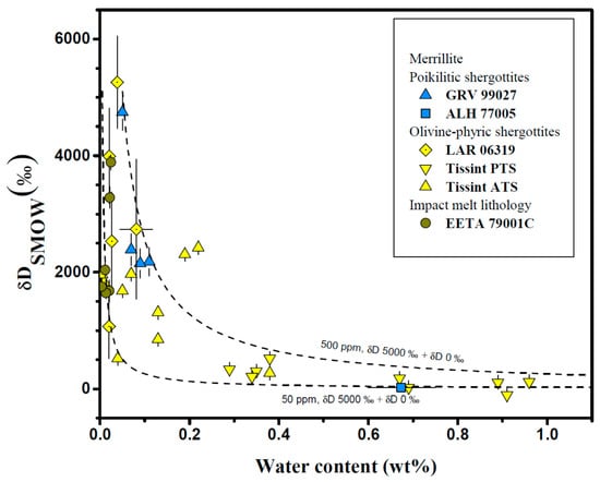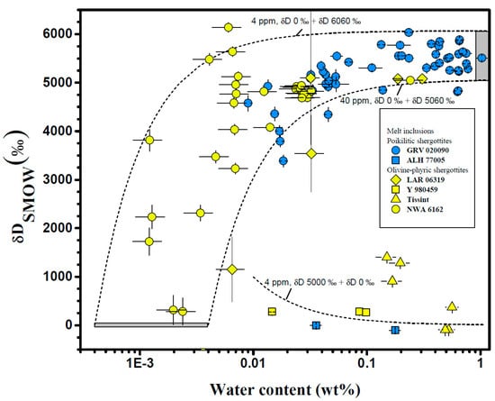 The relationship between water content and δD values of melt inclusions from different shergottites. The dashed lines represent the mixing of the post-erupted water (H2O = 4–40 ppm and δD ~ 0‰, lower left hatched area) and the Martian crustal water (δD = 6060–5060‰, upper right hatched area) from [68]. GRV 020090 from [67], ALH 77005 from [59], LAR 06319 from [53,69,72], Y 980459 from [53,72], Tissint from [52], and NWA 6162 from [68].