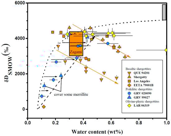 The relationship between water content and δD values in shergottite apatite grains. Poikilitic shergottites, GRV 020090, and GRV 99027, display a positive trend. In contrast, basaltic shergottites, QUE 94201, Shergotty, Los Angeles, and EETA 79001B show a negative correlation between H2O and δD. Most apatite grains from olivine-phyric shergottite LAR 06319 have similar δD values with water content varying from ~0.3 to ~0.6 wt. % except for a spot having a water content of ~1.0 wt. % and a δD of ~3300‰. The dash line shows the combined effect of the fractional crystallization (horizontal arrows) and assimilation (dot line) of Martian crustal materials with magma ascension [67]. QUE 94021 from [73], Shergotty from [51,61], Los Angeles from [61], EETA 79001B from [59], probably covering on adjacent mafic phases, GRV 020090 from [67], GRV 99027 from [63], LAR 06319 from [69], Zagami from [58].