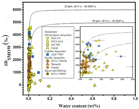 The relationship between water content and δD values of shergottite maskelynite. Most shergottite maskelynite has water content less than 200 ppm but significantly large variation in δD values, plotting along a two end-member mixing trend, except for several grains displaying a negative correlation between the water content and δD values. The inset diagram magnifies the data ranging from 0 to 500 ppm. The dashed lines show the mixing of the post-erupted water (H2O = 20–80 ppm and δD ~ 0‰) and the Martian crustal water (δD = 6060–5060‰) from [68]. Tissint from [52,60], EETA 79001C from [71], NWA 6162 from [35], Shergotty and Zagami from [125], ALH 77005 from [124], and the other literatures are from [59].