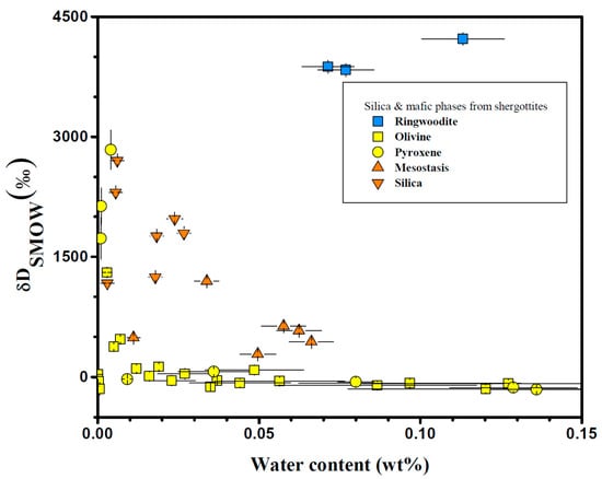 The relationship between water content and δD values of silica and mafic phases from Martian shergottites. Ringwoodite found in Tissint from [65], post-stishovite (silica) and mesostasis of Shergotty and Zagami from [59], Olivine and pyroxene of Tissint, Shergotty, Zagami, EETA 79001A & C, and ALH 77005 from [51,52,59,65,71].