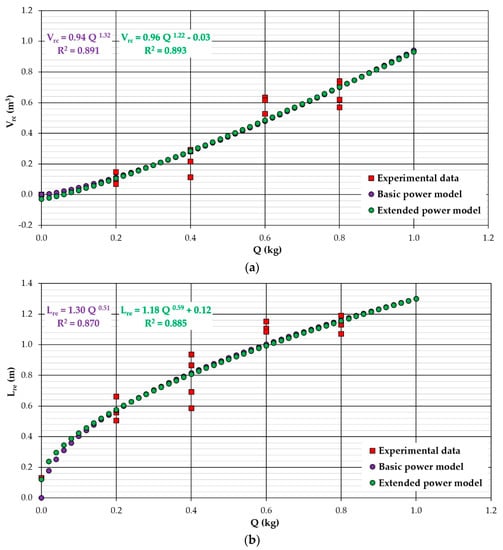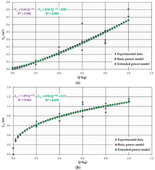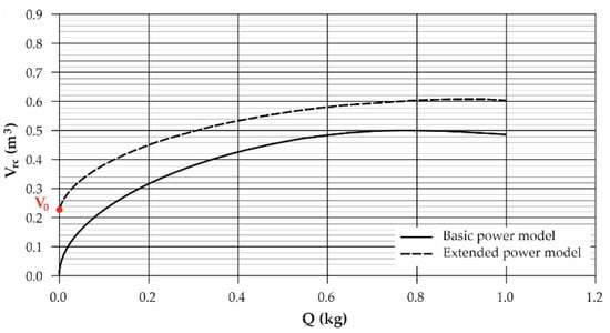 Schematic of basic and extended power model for spherical cavity volume increase Vrc (m3) in dependence on the mass of explosive charge Q (kg).
