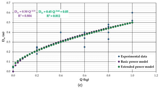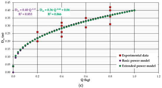 In all six cases, combinations of one of three efficiency indicators (Vrc, Lre and Dre) and type of explosive (Pakaex and Permonex V19), power model turned out to be the most efficient. Power model gives smallest estimation error values shown as the sum of square residuals (SS), largest values of determination coefficient (R2) and smallest loss of information shown by Akaike’s Information Criteria (AIC and AICc) [].