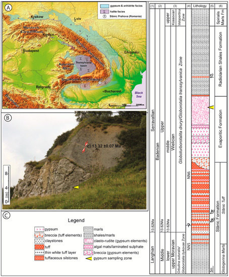 (A) Areal distribution of Late Badenian evaporitic deposits in the Carpathian area with the position of Slănic-Prahova locality (Piatra Verde/Green Stone; 1); (B) Photo of Piatra Verde section shows the upper part of the Evaporitic Formation (yellow arrow indicates the sample position) and Radiolarian Shales and Spirialis formations (red/white arrows indicates the position of the volcanic ash layer dated at 13.32 ± 0.07 Ma by [14]; (C) Lithostratigraphy at the Green Stone Hill (Muntele Piatra Verde) after [2,3,11,16]. (1) Mediterranean regional stages [17]; (2) Central Paratethys regional stages [18]; (3) Substages and Forams biozonation after [5,6,7,8] (4) Calcareous Nannoplakton Zonation [19]; (5) Events: (a) Last Common Occurrence (LCO) Sphenolithus heteromorphus [11]; (b) absolute age of a white tuff layer 13.7 ± 0.26 Ma [2]; (c) absolute age of a tuff layer 13.32 ± 0.07 Ma [14]; (6) formation names for the post-tectonic cover deposits of the Tarcău nappe.