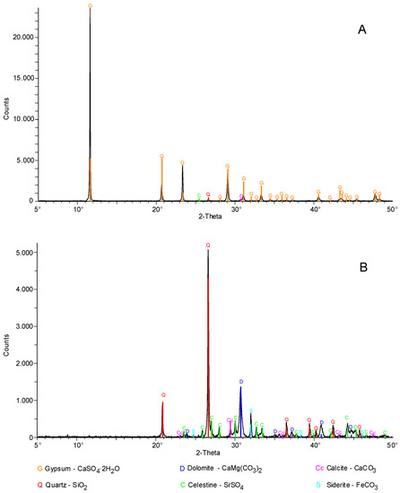 In Figure 2A, XRD-powder analysis of the bulk rock sample shows the presence of gypsum with minor amounts of quartz, dolomite and celestine. Calcite is diluted below the detection limit of the method. As determined with the Scheibler apparatus, the total carbonate content of the sample is 3.51 weight % (average of two analyses 3.48 and 3.54 wt.%). After gypsum dissolution with acetate, in the residuum, quartz, dolomite, siderite, celestine and calcite were detected in the fraction 63–150 micron, which hosted most of the fossil remnants (Figure 2B). Moreover, using the experimental data, namely the Scheibler measurement on total carbonate before dissolution as well as the partitioning between carbonates obtained by XRD after dissolution, it is possible to calculate a rough estimation of the fraction of various carbonates in the bulk sample. Accordingly, the content of calcite, dolomite and siderite was performed from the main peak areas (at 3.03, 2.89 and 2.80 Å): ~5% calcite, ~80% dolomite and ~15% siderite, which corresponds to calcite content in the bulk sample MV19 before dissolution of ~0.2 weight %. These quantitative estimations show how efficient the present method is, allowing final concentration of foraminifera from a bulk sample with trace calcite content.