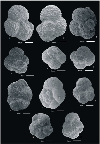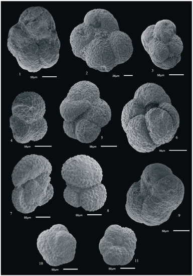 Planktonic foraminifera identified in the gypsum sample (SEM pictures): (1–4). Globigerina bulloides d’Orbigny; (5,6). Globigerina bollii Cita & Premoli-Silva; (7,8). Globorotalia transsylvanica Popescu; Paragoborotalia sp.; (9,11). Tenuitella angustiumbilicata (Bolii); (10). Globorotalia praescitula Blow.