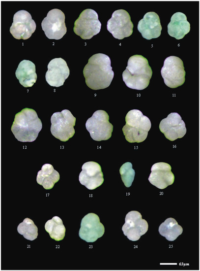 - Iaccarino, S.M.; Premoli, S.; Biolzi, M.; Foresi, L.M.; Lirer, F.; Turco, E.; Petrizzo, M.R. Practical Manual of Neogene Planktonic Foraminifera; International School of Planktonic Foraminifera, Universita degli Studi di Milano, Dipartimento di Scienze della Terra “Ardito Desio”: Milano, Italy, 2007; 143p. [Google Scholar]