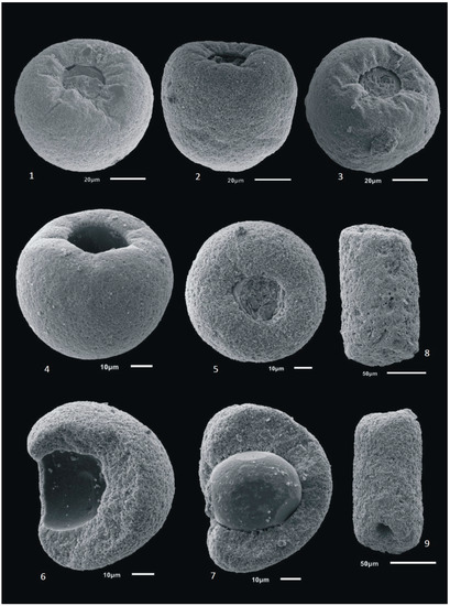 In the microfossil assemblage, cysts of Halicoryne morelleti (Pokorny), a green algae, were also identified (Figure 6). Most cysts have a spherical shape, sometimes they are ovoid. They have no contact traces, which could indicate that they were separated during life. This type of algae is usually associated with microfossils of the Sarmatian age [34,35]. In only one area from Romania (Costei locality), these algae are mentioned for Badenian deposits [36]. In Poland, green algae assigned to Halicoryne cf. morelleti (Pokorny) are found together with marine shallow-water ostracod fauna indicating the Badenian age [37]. These green algae lived in marine environments, mainly shallow (up to 30 m depth), with normal salinity and subtropical-tropical waters [37,38], but they could adapt to lower salinity conditions [34]. They lived in low turbulence environments typical for coastal lagoons.