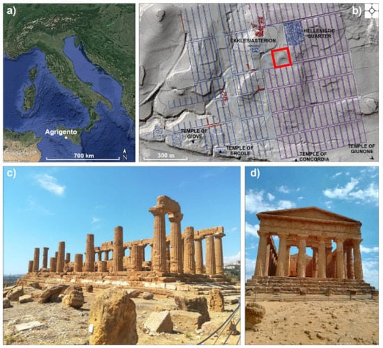 Location of Agrigento on a Google EarthTM satellite image (a), reconstructive map of ancient Agrigento on Laser Imaging Detection and Ranging (LIDAR) analysis (made by G. Pambianchi and F. Pallotta, Camerino University) with indication of the surveyed area in red (modified by Brienza []) (b), the Temple of Giunone (c), and Temple of Concordia (d).