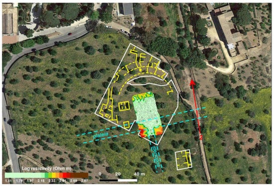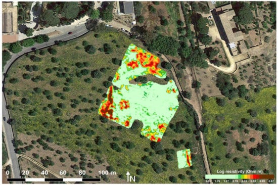 Non-invasive geophysical methods are a useful tool for the reconnaissance of buried structures into the soil [,]. The magnetic method, the induced electromagnetic technique, electrical resistivity tomography (ERT) and ground penetrating radar (GPR) are commonly employed to discover potential subsurface targets that could be related to ancient remnants.