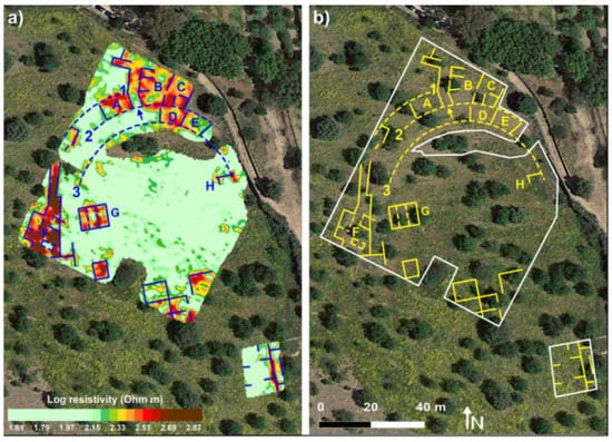 In the northern area it is possible to identify, within the high resistivity zone, some alignments that define probable internal divisions articulated radially (spaces A–E in Figure 5). High resistive elements can be associated with walls, room limits, even if defined in a fragmented way.