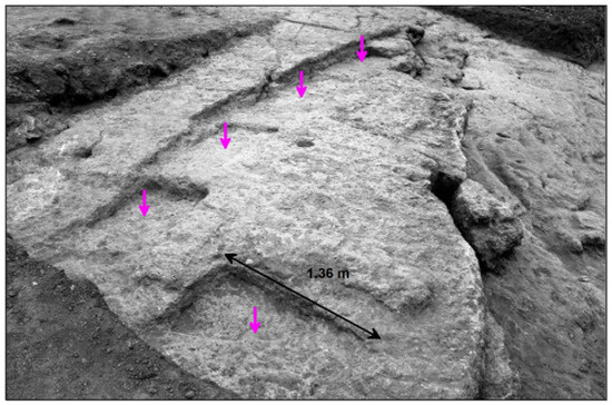 Cuts in the rock with footprints of seats (marked with pink arrows).