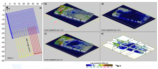 Area 3: grid data acquisition (blue, red, and yellow lines are, respectively, spaced 1, 1.5, and 2 m) (a), 3D voxler heightfields maps at 1.5 (b), 3 (c), and 4.5 m (d) in depth and sections of the imaged resistivity volume (e).