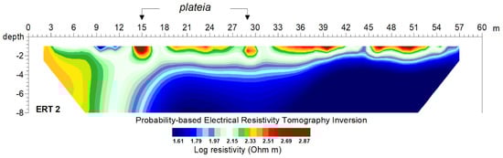 In addition, some vertical sections were analyzed with the aim of clarifying the complex stratigraphy of the site (Figure 12 and Figure 13). ERT 1 (Line 1 in Figure 3) belongs to the dataset of area 3. The section provides evidence for the presence of a clear passage from medium/high resistivity layers to low resistivity ones (in blue in the images), probably clay, at an average depth of 4 m. It leads to suppose that the step plane in phase with the theater had to be at a lower level than the current floor (Figure 12). ERT 2 (Line 2 in Figure 3), on the eastern terrace of the theater, shows, at the intersection with the hypothetical plateia, a gradual deepening of the high resistive layer, providing evidence of a likely passage from the northern block of the city to the southern one (Figure 13). The high resistive values at the origin of the section may be interpreted as buried archeological structures delimiting the southern part of the plateia while the low resistivity values at depths below to 4 m attest the presence of a clayey terrain.