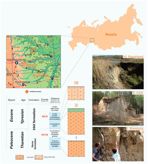 This paper presents new data on clay and detrital mineral assemblage of diatomites and diatomaceous clays. We studied diatomites and diatomaceous clays from three large natural and man-made outcrops located at the western margin of the ancient Siberian Sea (Figure 1). These rocks successively compose the primary part of the Paleocene–Eocene siliceous sequence, and they were formed before (Paleocene diatomites of the Brusyana section) and after the PETM (Eocene diatomites of the Irbit deposit and Eocene diatomaceous clays of the Shadrinsk deposit). The age of the rocks being studied was reliably established based on the results of diatom analysis in the previous work [7].