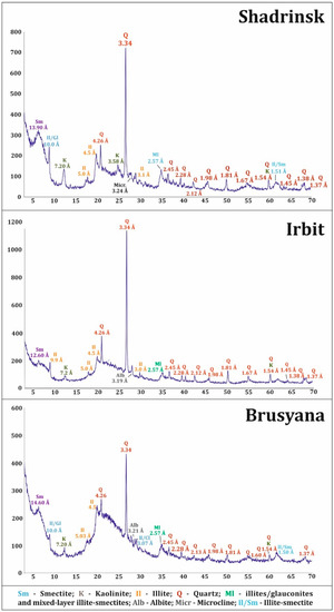 The clay component was extremely diverse in composition. On the diffractograms of diatomites and diatomic clays, illite reflections with interplanar spacings of 9.9 Å, 10.00 Å, 5.0 Å, 4.47 Å, 2.57 Å were observed (Figure 2). The minerals of the smectite group were identified on the diffraction patterns of samples of Irbit, Brusyana and Shadrinsk. Smectites have labile interlayer spaces and, when air-dried, are characterized by basal reflections defined by the composition of the exchange cations. The interplanar distances of smectite reflections in the small-angle region for Irbit samples were 12.60 Å, Brusyana-14.63 Å, Shadrinsk-13.91 Å. Kaolinite was found in all samples of Brusyana, Irbit and Shadrinsk. It clearly stands out in the diffraction patterns according to the reflections of 7.20 Å and 3.58 Å.