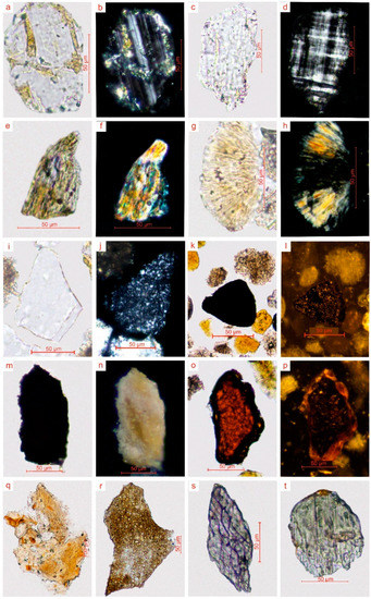 Minerals of the terrigenous fraction of diatomites and diatomaceous clays: Diatomites of the Irbit deposit: (a,b) plagioclase grain with fractures filled with illite: (a) parallel nicols, (b) crossed nicols; (c,d) a microcline grain with specific twin pattern: (c) parallel nicols, (d) crossed nicols; (e–h) hydrated flakes of biotite and muscovite, as well as a mica flake with authigenic quartz between fibers: (e–g) parallel nicols; (f,h) crossed nicols; (i) regenerated quartz grain, parallel nicols, (j) fragment of siliceous rock, crossed nicols; Diatomaceous clays of the Shadrinsk deposit: (k,l) rounded pyrite grain from fraction 0.01–0.1 mm: (k) parallel nicols; (l) in reflected light; (m,n) leucoxenized ilmenite grain: (m) parallel nicols; (n) in reflected light; Diatomites of the Brusyana section: (o,p) hematite: (o) parallel nicols; (p) crossed nicols; (q–r) volcanic glass fragments; glauconite with variable amount of small grains of ore minerals, in transmitted light; (s) amphibole; (t) rounded pyroxene grain, parallel nicols.