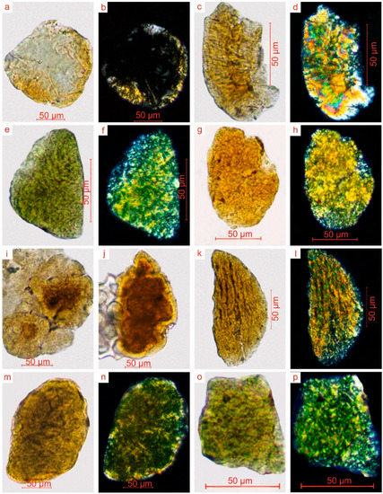 Mixed-layered illite–smectite formations in the rocks: (a,b) transformed volcanic glass fragment, rounded, with yellow rim (I morphotype): (a) parallel nicols; (b) crossed nicols; (c,d) lammelar-like highly inhomogeneous with high interreference colors (II morphotype); (c) parallel nicols; (d) crossed nicols; (e,f): semi-rounded yellow–green grains substrate on volcanic glass (III morphotype) (e) parallel nicols; (f) crossed nicols; (g,h) semi-rounded yellow grains (IV morphotype); (g) parallel nicols; (h) crossed nicols; (i,j) clay minerals formations with relics of biosiliceous substratum (V morphotype): (i) parallel nicols; (j) crossed nicols; (k,l) a volcanic glass fragment, sharply angular, with corrugated surface (VI morphotype): (k) parallel nicols; (l) crossed nicols; (m,n) highly rounded yellow grains substrate on volcanic glass (VII morphotype): (m) parallel nicols; (n) crossed nicols; (o,p) irregular shape green–yellow grains (VIII morphotype): (o) parallel nicols; (p) crossed nicols.
