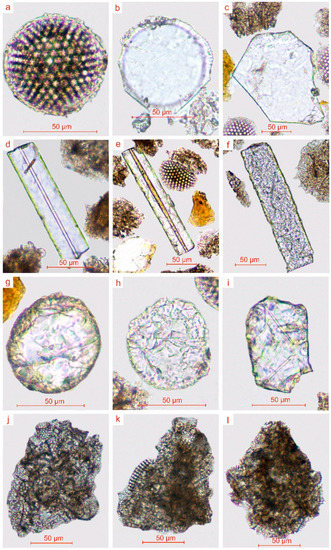 Biosiliceous components and the products of their transformation: Irbit deposit: (a) diatom valve; Shadrinsk deposit: (a,b) diatom valve recrystallized in tridymite, with newly-formed faces (fraction 0.01–0.1 mm); (c) tridymite crystal; (d–f) spicules of sponges: (d) sponge spicule in the axial channel, filled with a liquid; (e) sponge spicule with the axial channel, filled with Fe-rich illite; (f) spicule, altered and acquired globular structure; (g–i) fragments of sponge spicules, altered and morphologically different diatom detritus and grains of clayey minerals; (j–l) mixed clayey–siliceous aggregates.