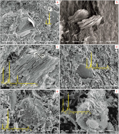 Scanning electron microscopy (SEM) images and Energy Dispersive X-Ray Spectroscopy (EDS) spectra of mineral components: (a) bioclastic debris and a single large quartz grain (Q); (b) illite, flake-shaped aggregates; (c) feldspar with traces of clay minerals formation (Fsp); (d–f) clay mineral formations: (d,e) illite or illite–smectite minerals; (f) kaolinite or kaolinite–smectite mixed-layer minerals.