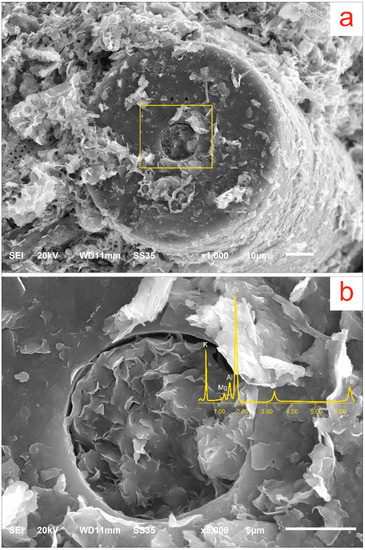 SEM images and EDS spectra of illite in the axis channel of a sponge spicule: (a) general view; (b) close-up view.