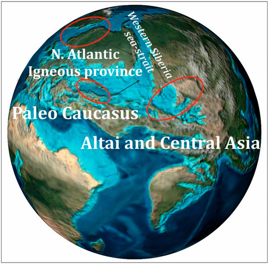 The issue of the transportation of the pyroclastic material into the sedimentation basin is of interest. On platform land in Central Eurasia, rare scattered foci of predominantly basalt volcanism [42] existed. The presence of isolated local volcanoes has been confirmed by effusive findings: in the Northern Aral Sea region, at the northern border of the Kazakh shield, within the Minusinsk depression, and to the south-east of the Voronezh anteclise. The established acid composition of pyroclasts, along with their small dimensions and often acute angular particle morphology, may be evidence for enriching sediments with eolian ash material as a result of air transport from the west and North Atlantic (Figure 8). The Eocene time in the Northern Sea (North Atlantic igneous province (NAIP)) was characterized by the colossal formation of igneous mafic rocks during the continental break-up between Europe and Greenland [43,44,45].