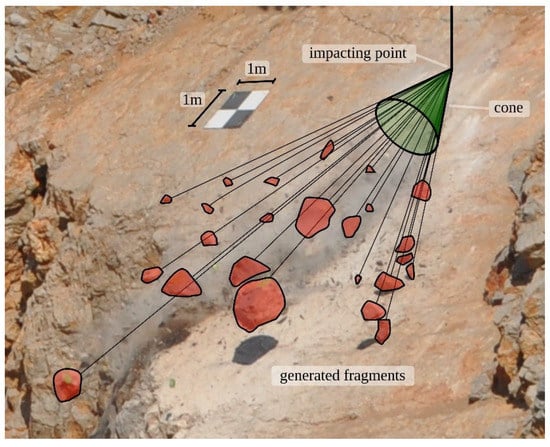 Finally, by adding a certain degree of stochasticity, the simulator defines the trajectories of the new fragments that are generated. The fragments are distributed within a cone of a given angle around the expected trajectory of the unbroken block. This approach is based on field observations (Figure 1).