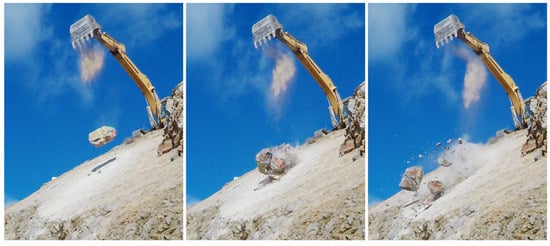 A backhoe was used to release the blocks from the top of the slope. Two marks painted on the edge defined the space in which blocks had to be released by the engine. The height at which each block was released depended on the operator’s criterion, for stability reasons. It ranged between 8 and 10 meters with respect the first impact point. Once the security protocol had been checked, the blocks were released (Figure 3).