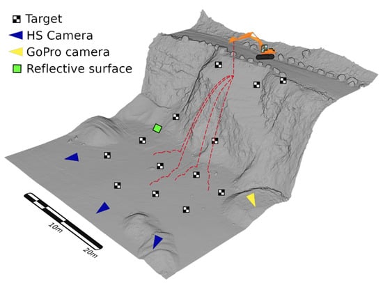 For georeferencing purposes, a total of 29 ground control points (GCP, targets and crosses painted on rock outcrops) were distributed throughout the scene. They were surveyed using GNSS technology to provide scale and georeference photographs and video images.