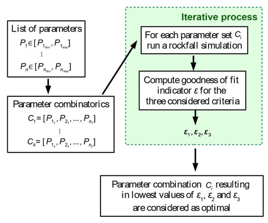 The optimization of the calibration consists of finding the combination of parameters that minimizes the value of ε for the three considered criteria. To achieve this, both the product and the sum of the resulting ε were compared between parameter sets and the lowest value was selected. Figure 6 shows the workflow for the entire calibration process.