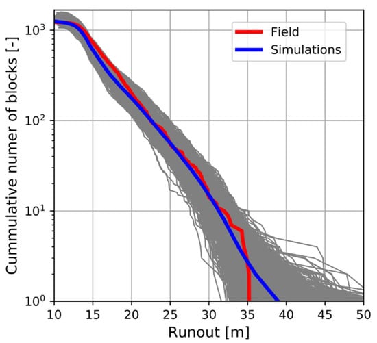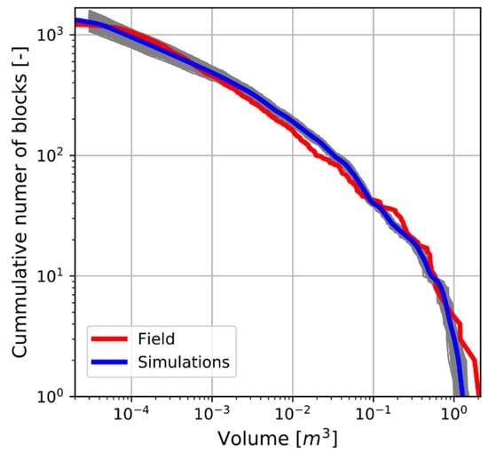 Comparison of rockfall block size distribution measured in real-scale tests with the average of the simulation results. Results of each individual simulation are shown in gray, while the average behavior is in blue.
