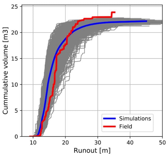 After the calibration process, a set of parameters minimizing ε was obtained for each of the criteria. Figure 7, Figure 8 and Figure 9 show the resultant volume, runout and cumulative volume distributions of the 1000 simulations performed with the optimized parameter set and using different seeds. The average curve of all simulations (blue) adjusted with values of ε of 0.028, 0.0015 and 0.4 for the three criteria, respectively. The values of the parameters resulting from the calibration are: na1 = 0.0031, na2 = 0.7562, b1 =−1.6125, b2 = 2.4875, q1 = −0.5125, q2 = 1.0, Kna = 19.54, Knb = −1.03, Kta = 22.6 and cone = 83°.