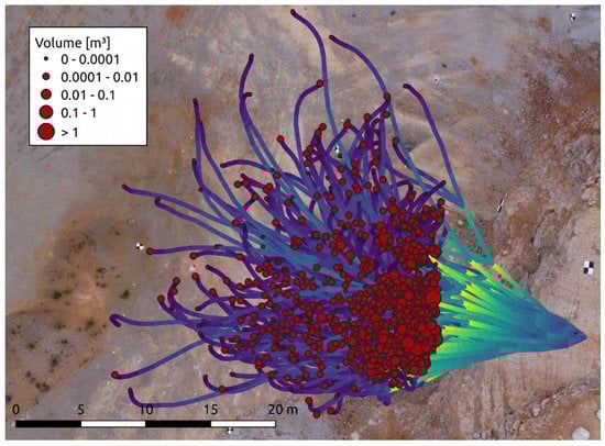 Manual georeferencing of the location of each fragment in the field was not possible since it would have been extremely time-consuming, considering that the volume of 1242 fragments was measured. The runout of each fragment was measured in the orthophoto provided by the UAV flights. The minimum fragment size measured was 8 × 10−6 m3, which corresponds to a 2 × 2 × 2 cm fragment. The location and the projected area of each block in the orthophoto was measured and then the volume of each fragment was calculated from Equation (8).