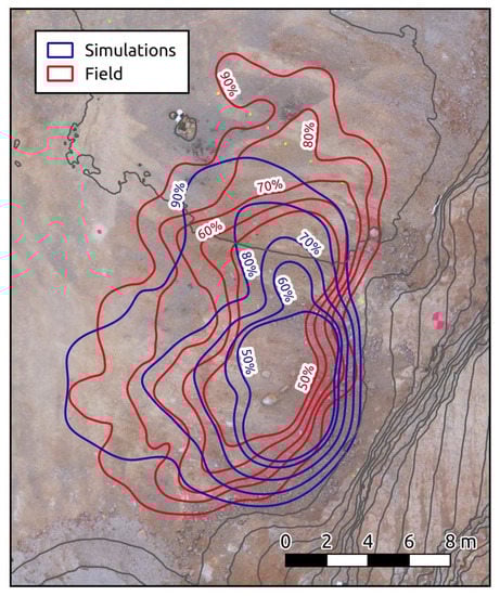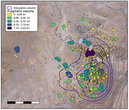 Contours containing a certain percentage of deposited volume and measured fragments on the orthophoto obtained from the simulations.