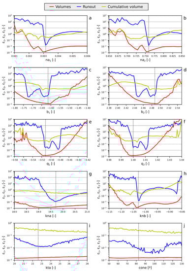 The parameter set considered as a reference was the result of the calibration process. Each plot in Figure 14 a–j shows the values of the three ε statistics of each one of the calibration criteria (Figure 7, Figure 8 and Figure 9), as a function of the tested parameter. The simulations showed high sensitivity to the pairs of parameters controlling fragmentation: na1, na2; b1, b2; and q1, q2 (Figure 14a–f). Each pair displayed similar behavior within the testing range, as expected. Slight variations in the shape of these pairs of curves was due to discretization of the evaluation interval in each case. Note that b1, b2 and q1, q2 define a line, so the shape of the distributions must be very similar regardless of the parameter that varies (but with its corresponding value interval). In the case of b, with a focus on runout only, two minimums could be found in the optimization curve but the volume curve showed a clear minimum around b1 = −1.6 and b2 = 2.49. The same occurred with q where the optimum value was found to be around q1 = −0.54 and q2 = 1. A focus on the interval of values that give, for example, a value of the indicator ε smaller than one in the case of runouts reveals that the range of acceptance of na1, b1 and q1 represents respectively 29%, 8% and 7% variation with respect to the optimum value, while for parameters na2, b2 and q2, the values are, respectively, 5%, 2% and 1.3%. As expected, slight changes in the exponent of the potential function controlling the new generated area and the slopes of the lines controlling b and q were found to have more influence on the final result.