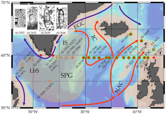 The map of analyzed surface sediment samples (red dots) on the North Atlantic transect at 59.5° N (Table A1). The name of the station follows the position of the sample. White crosses mark samples with N. seminae; percentages after the station name show N. seminae abundances. Green-framed red dots mark samples with warm-water subtropical diatoms. Red arrows mark warm surface currents, and blue arrows mark cold surface currents. SPG is Subpolar Gyre, LbS is Labrador Sea, IS is Irminger Sea, NAC is North Atlantic Current, IC is Irminger Current, EGC is East Greenland Current, FSC is Faroe-Shetland Channel. The source of the blank map is Ocean Data View software [13]. The microphotographs of N. seminae valves are presented.