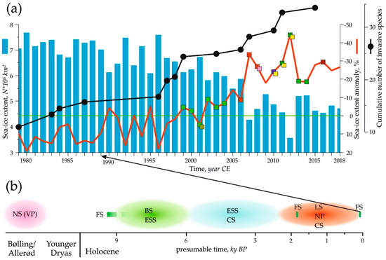 Records of N. seminae in the modern Arctic and North Atlantic and the Holocene sediments of the Arctic and Nordic Seas (see references in the Figure 3 caption). (a) N. seminae in the modern Arctic and North Atlantic: black-framed green and blue squares mark observations of N. seminae in the plankton, black-framed yellow squares mark observations of N. seminae in sediment trap NAP, black-framed red, brown, and rose squares mark observations of N. seminae in surface sediments. The Arctic sea-ice extent (vertical blue bars) and its anomalies (red line) are from [80]. Cumulative number of the invasive species (black dots and line) in the marine Arctic is from [81]. (b) N. seminae in the latest Pleistocene and Holocene sediments: green bars, green, blue, red, and pink ovals mark observations of N. seminae in the different areas within the different time intervals. NS(VP) is Norwegian Sea (Vøring Plateau), FS is Fram Strait, BS is Barents Sea, LS is Laptev Sea, ESS is East Siberian Sea, CS is Chukchi Sea, NP is North Pole.