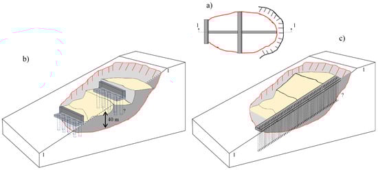 Historically, the management of landslide risk within chain areas has been hardly sustainable, due to the cost of the engineering interventions [,,,,]. This is especially the case in regions where deep slow landslides are widespread, as with deep landslides, the installation of earth retaining structures, representing the traditional mitigation measure, does not provide long-lasting successful mitigation effects. This is because of the large size of deep landslide bodies (maximum depth higher than 30 m, according to Cruden & Varnes []), whose kinematics may be not influenced significantly by the installation of either transversal pile diaphragms (e.g., at the landslide toe, or at mid-height; Figure 1a,b), or longitudinal ones (Figure 1a–c []). Eventually, a combination of various retaining diaphragms of significant depth (e.g., piles of more than 40 m depth in Figure 1), might provide a mitigation effect. Such intervention strategy, though, is recognizably highly expensive and does not necessarily restrain the development of new shear bands and further progressive failure [].