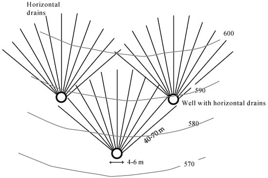 For those slopes where the piezometric regime acts as landslide predisposing factor [], drainage may represent a more effective mitigation measure. This is the case, for example, in deep landslides whose displacement rates are related to the piezometric excursions at depth, which are in turn connected to the slope–atmosphere interaction [,]. However, the traditional drainage systems used for the mitigation of deep landsliding, such as deep drainage wells combined with sub-horizontal drainage pipes (Figure 2 [,]), are also costly and of expensive maintenance. Furthermore, the drainage capacity of the sub-horizontal drainage pipes is easily jeopardized by their interaction with the moving landslide, which may cause the pipe failure.