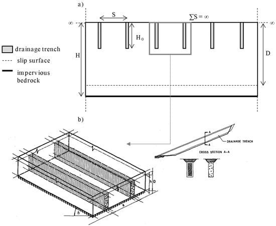 In the past decades, significant research has been addressed to the hydraulic efficiency of drainage trench systems, which are a robust and relatively not expensive engineering opera [,]. In particular, since the late 1970s, research in the field of slope stabilization has paid attention to the effects of drainage trench systems on the slope stability factor, F, in order to optimize the design of such mitigation measure.