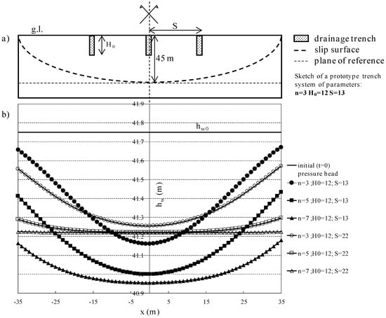 Figure 4 shows the results of the analyses carried out for trench systems of different n, of depth H0 = 12 m and spacing S of either 13 m or 22 m. The figure reports the pressure heads, hw, predicted after 5 years of consolidation along a horizontal plane located at 45 m depth. The different curves in the figure refer to systems of different S/H0, but for constant H0 = 12 m. Figure 4 reports also the initial hw0 at 45 m depth, assumed to be constant as for a hydrostatic initial condition in the section. The “necklace” shape of the hw–x curves corresponds to the group effect cited in the introduction and suggests that, at depth, the drainage trench system generates a piezometric head drop that varies with x and is maximum below the center of the trench system, at x = 0 (point A of Figure 9 and Figure 10). Furthermore, the results show that the piezometric head at large depth is controlled not only by the S/H0 ratio, but also by the global width ΣS of the trench system, and consequently by the number of the trenches n. The hw drop, highest below the center of the trench system, suggests that with landslides of bowl-shaped slip surface, centering the trench system with respect to the landslide body longitudinal section optimizes the stabilizing effect of the system, as shown in Figure 9 and Figure 10. In this way, the deepest portion of the sliding surface benefits from the maximum hw drop determined by the drainage system. The hw drop along the lateral portions of the slip surface is higher than in the central portion because these are shallower.