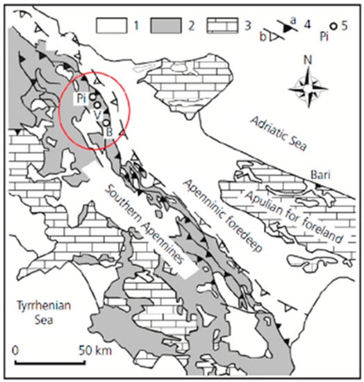 Schematic geological map of the Southern Apennines and location of the study region (included in the ellipse). Key: 1—marine and continental deposits, wedge basin deposits, 2—Apenninic units, 3—carbonate platform units, 4—main thrust (a) and buried overthrusting (b), 5—case studies: B—Bovino, Pi—Pietramontecorvino, V—Volturino (from work in []).