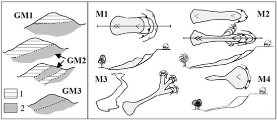 Geomechanical set-ups (GMi) and landslide mechanisms (Mi), typical of Daunia Apennines; key: (1) rock and (2) soil class materials (from work in []).