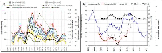 Fontana Monte slope (Volturino) (a): cumulative rainfalls; piezometric levels along SC1; displacement rates measured at 6 m and 24 m depth through inclinometer SD1 (from []). Pisciolo slope (b): displacement rates measured through the GPS sensor S2 and the inclinometer I12, at 19 m depth; piezometric levels along P7; 180 days cumulative rainfalls (from work in []).