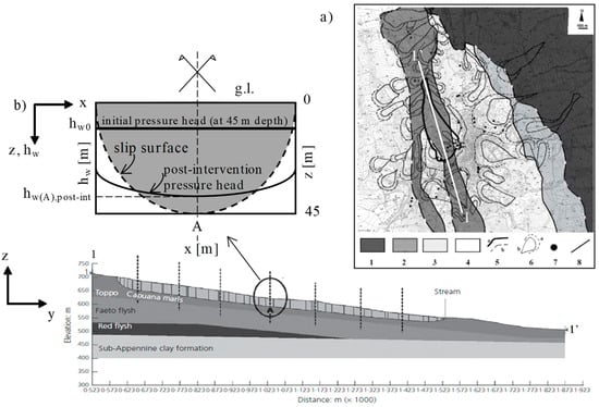 (a) Geomorphological map of the Fontana Monte (Volturino) unstable slope (revisited from work in []). Key: (1) sub-Apennine clay, (2) Toppo Capuana clay, (3) Red Flysch, (4) Faeto Flysch, (5) geological contact, (6) landslide, (7) piezometric and/or inclinometric survey, (8) trace of the section in panel (b). Longitudinal section and zoom of transversal section ((b), revisited from work in []) of the slip surface with the pressure head distributions on a horizontal plane at 45 m depth.