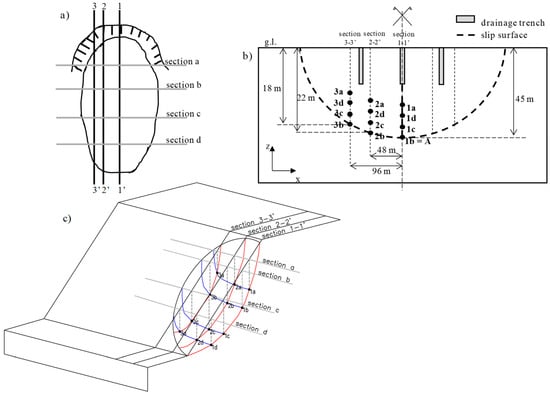 Scheme of reference in the calculation: map of the landslide body (a); sketch of the transversal section, with the traces of the longitudinal sections and the piezometric head calculation points of reference in the 2D stability analyses (sections 1-1′, 2-2′ and 3-3′ in (a)) (b); axonometry of the bowl-shaped slip surface (c) and of the piezometric head calculation points.