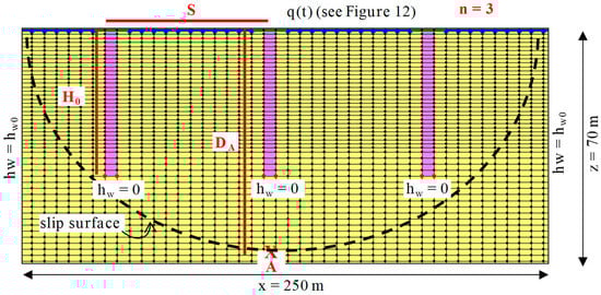 In Figure 10, a prototype system is shown, made of three trenches (n = 3); the mesh is coarser at the bottom of the model and finer in the upper part, discretized by means of 18000, 4-noded quadrilateral elements, with four Gauss points, and 18,281 nodes. The drainage in each trench has been guaranteed by setting zero pore water pressure at the base level of the trench and applying the water retention function and the permeability function of a coarse soil filling the trench.