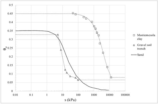 Assuming partially saturated conditions for the soil above the water table. hw is the pore water pressure head, and θ = S n is the volumetric water content, where S is the degree of saturation and n is the porosity. The modeling has implemented the soil water retention curve (WRC), θ(s) (where s is the soil suction, equal to (hw γw) < 0), and the soil hydraulic conductivity function, K(s), which has been assumed to be related to θ(s) according to Mualem []. For θ(s), the adopted WRCs refer to interpolation of laboratory test results, as shown in Figure 11, whereas for K(s), the expression from Mualem-Van Genuchten [] has been adopted. In particular, the WRC used for the clay was derived from experimental laboratory tests, carried out by Cafaro & Cotecchia, 2001 [], on an unfissured high retention overconsolidated clay, whereas the WRC of the soil in the trenches has been taken as that typical for gravel []. In Figure 11, the WRC of the two soils, clay and gravel, used in the model are compared with the WRC measured for a silty sand by Bottiglieri et al. []. For the permeability of the saturated clay, a value representative of the “field clay permeability”, which is about Ksat = 1 × 10−9 m/s, has been adopted, following what already done with reference to the Fontana Monte slope by Lollino et al. [] and Cotecchia et al. []. Both the high retention capacity and the very low permeability of the clay implemented in the model are to be considered conservative in the assessment of the efficiency of the drainage system [].