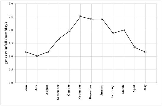 Initial hydrostatic conditions with water table at 3 m depth below g.l., representative of winter conditions, have been set in the analyses []. At the lateral boundaries of the model, a constant hydraulic head (hydrostatic condition) has been assigned, hw = hw0, which represents the most conservative boundary condition for the drainage efficiency; the lower boundary has been set as impervious. At the ground level, the boundary condition has been set as a specific flow rate q(t), variable over time according to the rainfall regime of the Fontana Monte slope. Such flow rate has been set constant over each month of the year and equal to the mean value of the monthly rainfall, which has been derived from the database of the monthly rainfalls recorded at the meteorological station of Volturino in the period 1972 to 2009 (Figure 12). Both evapotranspiration and surface runoff have not been accounted for in the seepage analyses [], so that an overestimated water supply has been assumed.